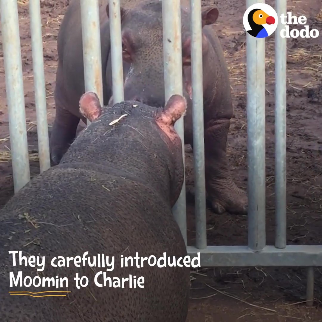 後來有一天,育幼院終於來了一隻小河馬姆明(Moomin,♀),一開始志工們還擔心牠們會不會處不來,好在牠們本就都是「河馬同鄉」,很快就熟悉了起來,而且姆明很喜歡查理,有時候還會吃查理的醋呢~