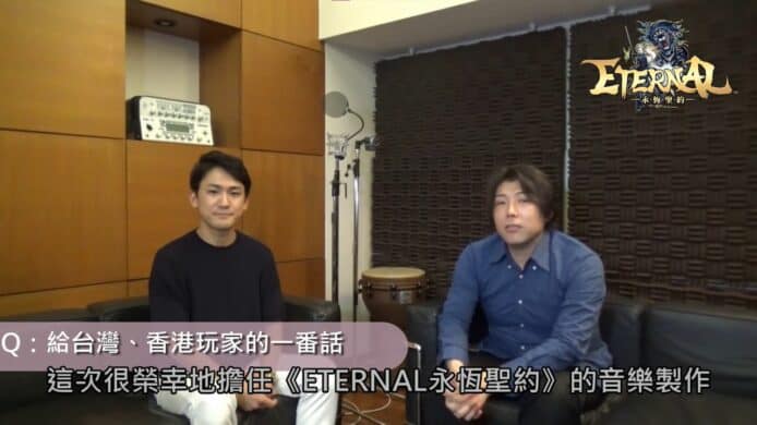 日本知名音樂團隊「MONACA」領銜作曲家帆足圭吾先生與高橋邦幸先生參與《ETERNAL:永恆聖約》遊戲的音樂製作。他們表示最初收到 ASOBIMO 非常厚的一疊設定資料,他們經過認真地詳細閱讀之後,開始有了確切的目標方向。遊戲音樂首要令玩家不要感到疲倦,特別要照顧玩家已打開遊戲,但沒有在遊玩的狀態,音樂要適合長時間播放。他們運用音色來營造出不同的音樂個性,在曲調的強弱上,反覆進行研究與討論後,才決定出最終方案。而 Boss 戰的音樂會符合日本遊戲風格,音樂張力較強,他們希望把最令人情緒高漲的音樂送給大家。