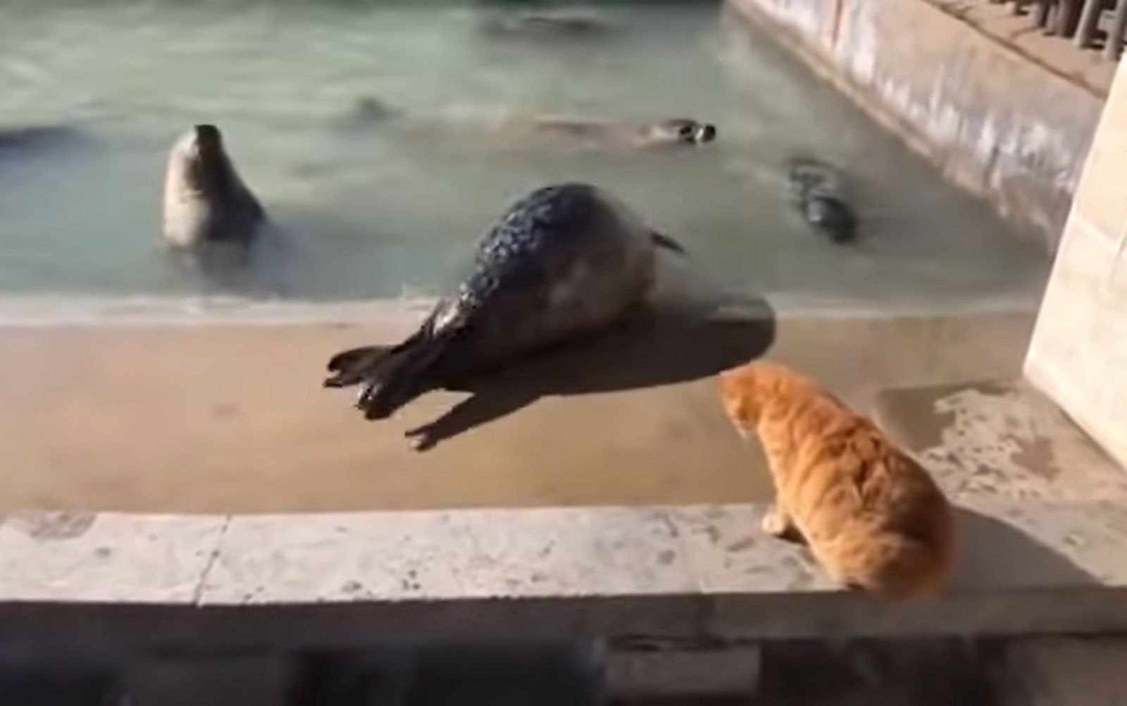 貓咪就是這麼霸道!Youtube頻道@RandomVideosFromTheWeb分享了一段貓咪與海豹互動的爆笑影片,只見當時海豹舒服趴在岸上休息,時不時還開心地叫了幾聲,只不過坐在旁邊圍牆的貓咪似乎被打擾到,瞬間就是一拳,讓海豹看起來真的超委屈~