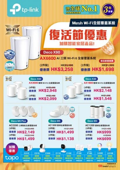 另外值得一提的是,現在如果購買任何 TP-Link Wi-Fi 6 路由器或 Deco 系列 Wi-Fi Mesh 路由器系統,都可以用優惠價加購 Tapo 智能家居系列產品,想建構智能家居,是時候了。