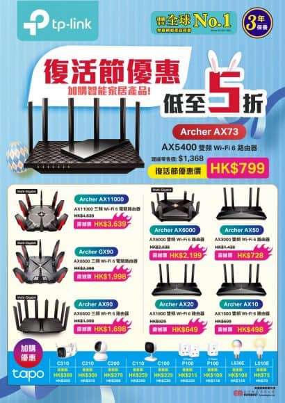 | Archer AX73 | HK$799.00 | HK$1,368.00 | 58 折 |