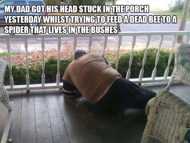7. 昨天我爸試著餵在灌木叢裡的蜘蛛,結果頭就被卡住了XDD