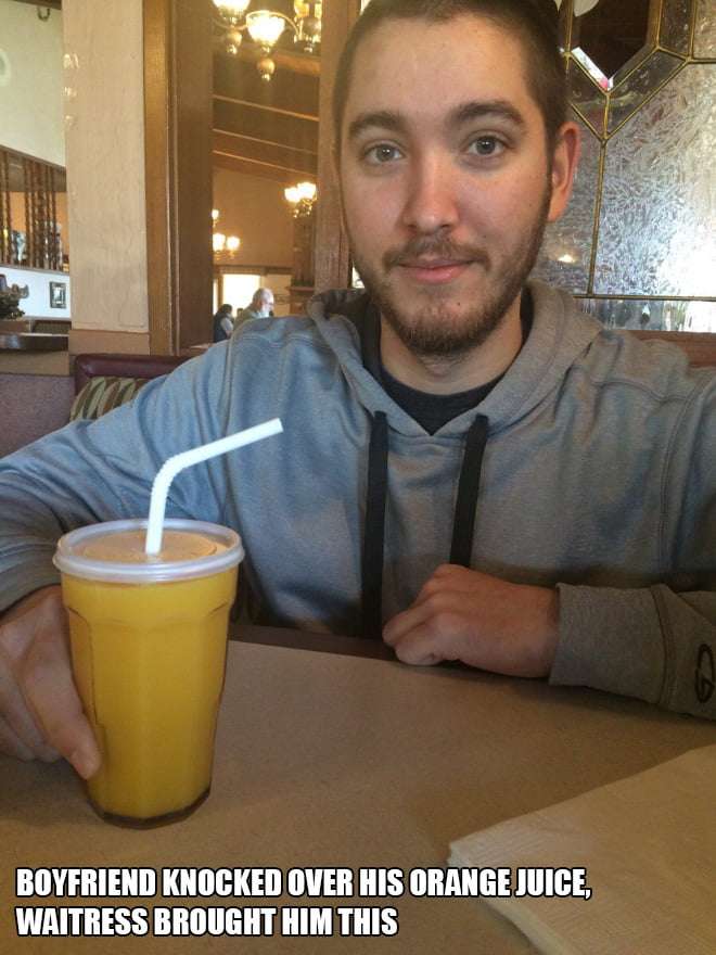 10. 當男友不小心打翻果汁後,服務生決定給他這個!