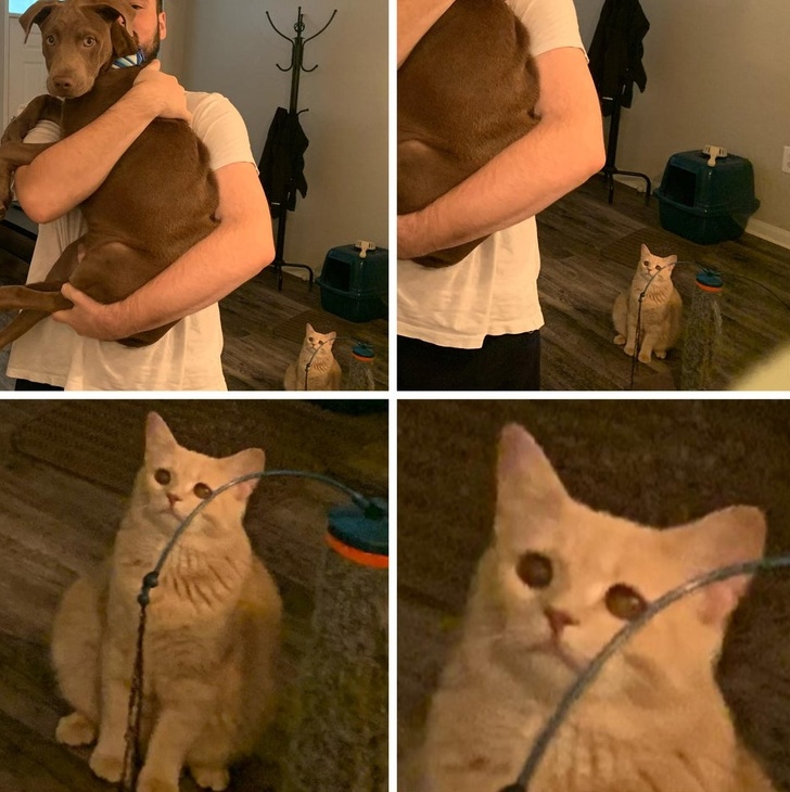 ▼「我們帶了一隻狗狗回家,貓咪看到後表情都不對了…」