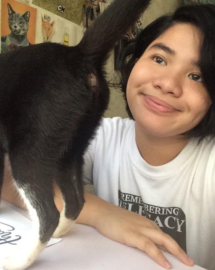 ▼當你想拍張自拍,你的貓跑來湊熱鬧時..