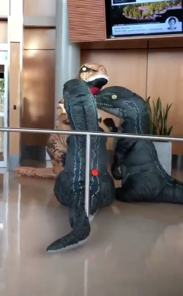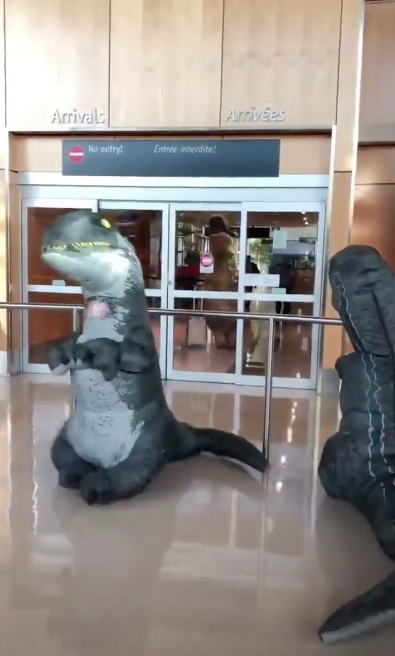 從這段在推特上非常火紅的影片中可看到,為了迎接風塵僕僕從遠方前來的阿嬤,這對非常用心的小朋友不但特別前往機場接機,甚至還換上時下最夯的「暴龍裝」,準備送給阿嬤一個大驚喜~