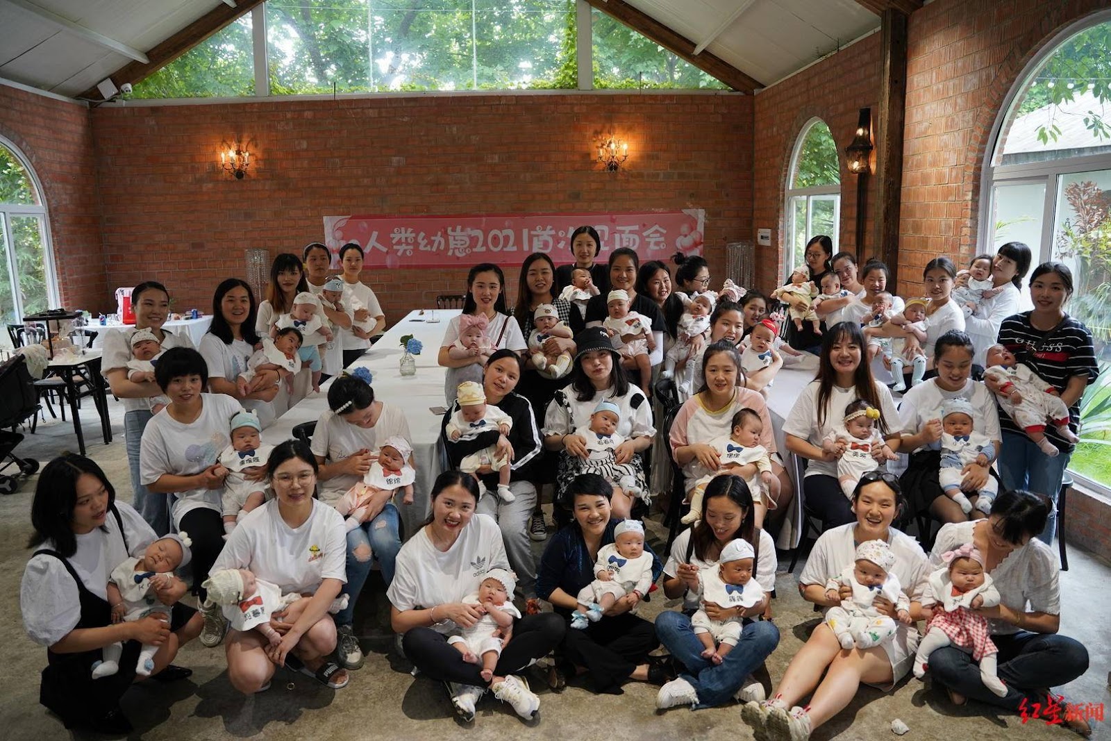 原本當天有35個寶寶,黃女士和另一位媽媽還給所有孩子訂做了圍兜,寫有各自的名字。「女寶寶就是紅色蝴蝶結,男寶寶是藍色的。」黃女士說,但其中兩位寶寶的家長臨時有事來不了,所以現場只有33個寶寶,還用了洋娃娃等臨時代替位置。