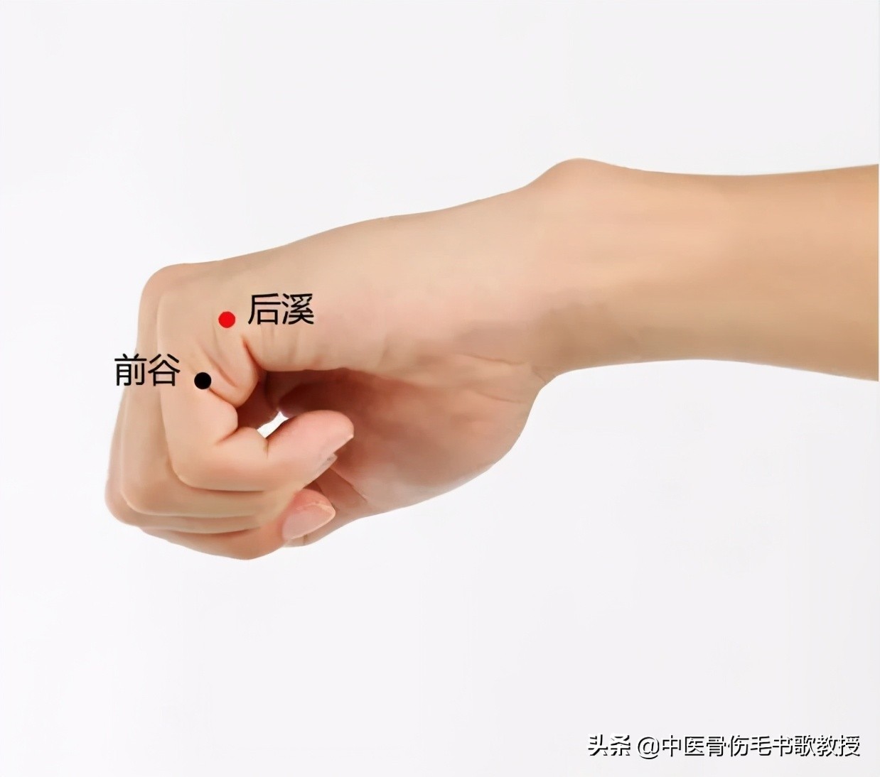 後溪穴很好找,仰掌半握拳,掌指關節後橫紋的盡頭就是該穴,把雙手後溪穴放在桌沿上,來回滾動3-5分鐘,次數不限,空閒的時候就可以做,後溪穴通小腸經和督脈兩經,因此刺激這裡就能疏通兩經在頭頂、肩背部的氣血,起到舒經活絡、通氣血的功效,從而緩解頸椎病引起頭暈。