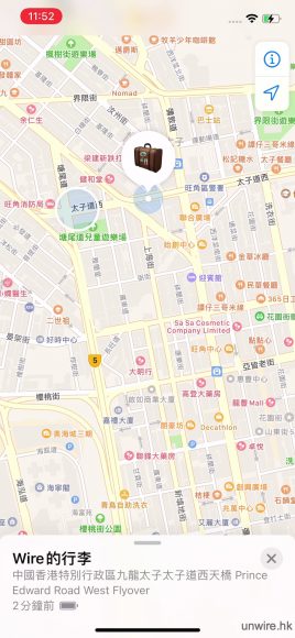▲小編手持iPhone與AirTag假扮被跟蹤(AirTag與另一部iPhone連結),可看到從旺角開始行蹤每幾分鐘就會更新一次