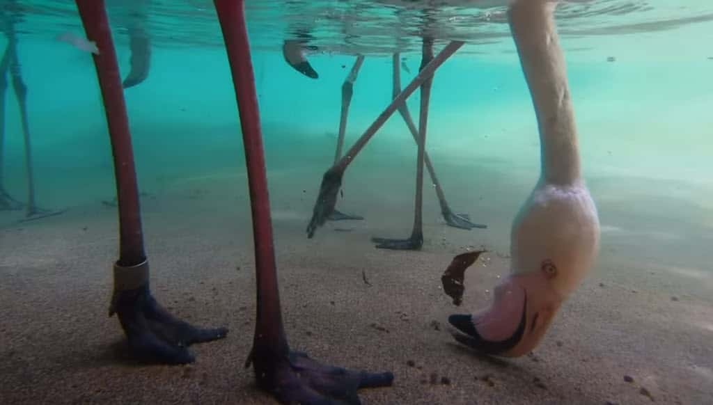 ▼紅鶴站在淺水中,彎下長頸,將彎曲的喙倒置在水裡,觸探水底取食。從影片中就能看到,紅鶴的喙非常特別,邊緣不僅有細毛,還有鋸齒狀結構。在水中覓食時,牠們的喙就像篩子一樣,能將食物吸入嘴巴裡,同時把多餘的水、泥沙排出去。