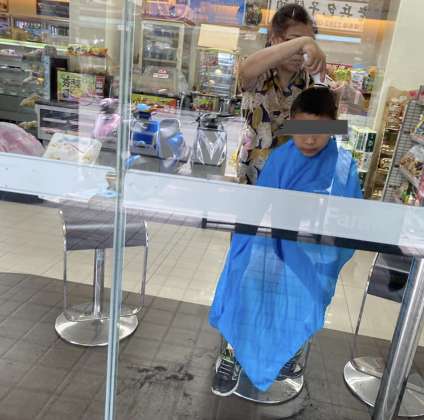 新服務?路過超商驚見大媽「披圍巾幫兒剪髮」 網怒批:恥力無極限!