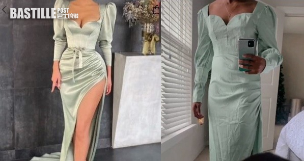 美國女子Natalie Tyson日前在TikTok平台上拍片分享姊姊友人網購中伏的經歷,她指該朋友早前在網店購買了一件淺綠色緞面洋裝,花了32.39美元(約252港元),雖然不算太貴,但認為質量應該也不至於太差。從買家提供的展示圖可見到,洋裝採用開高衩和腰部抓皺設計,模特穿起來身材玲瓏有致,十分吸引人購買。