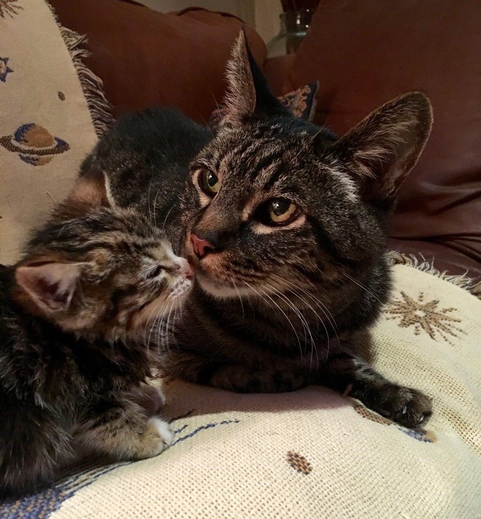▼Roxy似乎把自己當成了小貓的媽媽,小貓也非常黏牠,把牠當成自己的依靠。Sharra鬆了一口氣,她決定把小貓留下來,並給牠取名為Crenshaw。