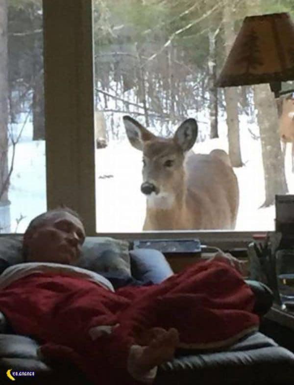 ▼有網友在臉書上分享了一系列非常有趣的照片,照片中有各種各樣的動物,牠們站在人類居所的門廊上、趴在窗檯上,專注地看向房間內,就像來拜訪人類的老友。