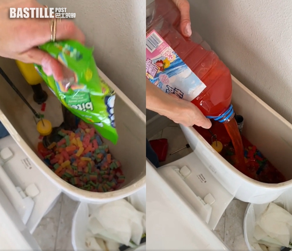 不時有新奇搞作的FB專頁The Anna Show日前上載了一條短片,當中的女子先用一件上衣將馬桶取水口堵住,之後倒入大量冰塊,2大桶家庭裝雪糕和一整包軟糖。之後又打開儲水箱,繼續放入軟糖並倒入雪碧、芬達等汽水。