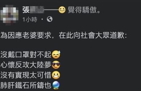 ▼張男收到罰單後,在臉書上公開發文道歉,他說:「為因應老婆要求,再次向社會大眾道歉。」他還寫了一首藏頭詩:「沒戴口罩對不起,心懷反攻大陸夢,沒有實現太可惜,肺肝鐵石所鑄也。」並附上自己的心情「覺得驕傲」。