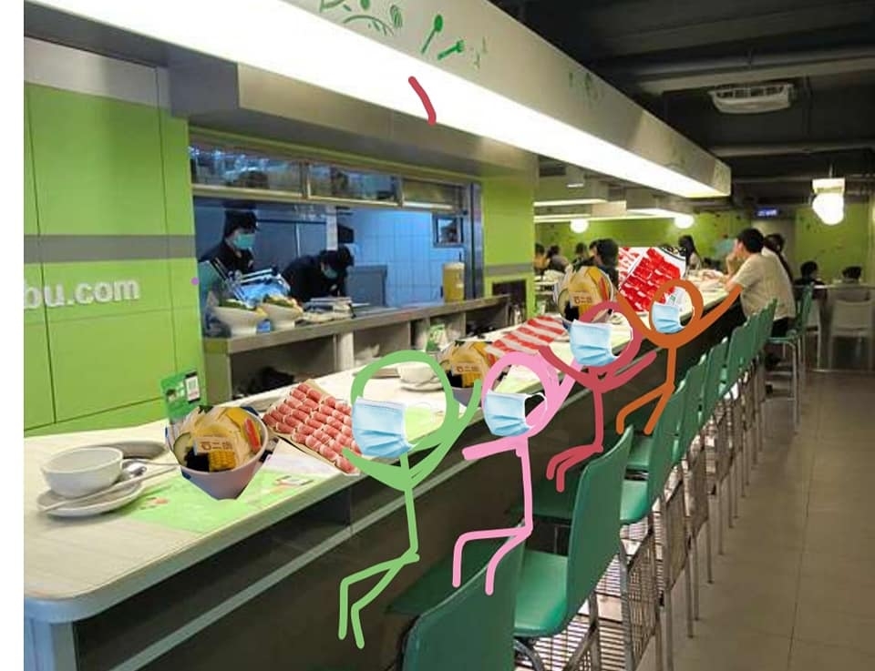 而為了增加外出聚餐的真實感,雖然大夥們已經紛紛入座,但還是不免俗地貼出噴酒精的圖片,讓大家在用餐之前先徹底消毒一番。待到大家都入座消毒完畢之後,就可以起身去拿餐具、醬料等好料上桌囉~~