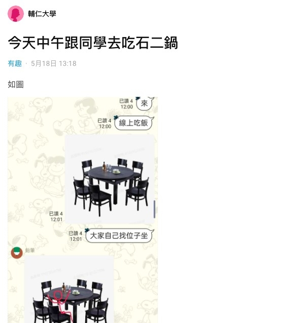 最近有網友在全國升為三級警戒時,於Dcard有趣板上發文表示「今天中午跟同學去吃石二鍋」,並放出數張與朋友一起「線上聚餐」的群組的對話紀錄!