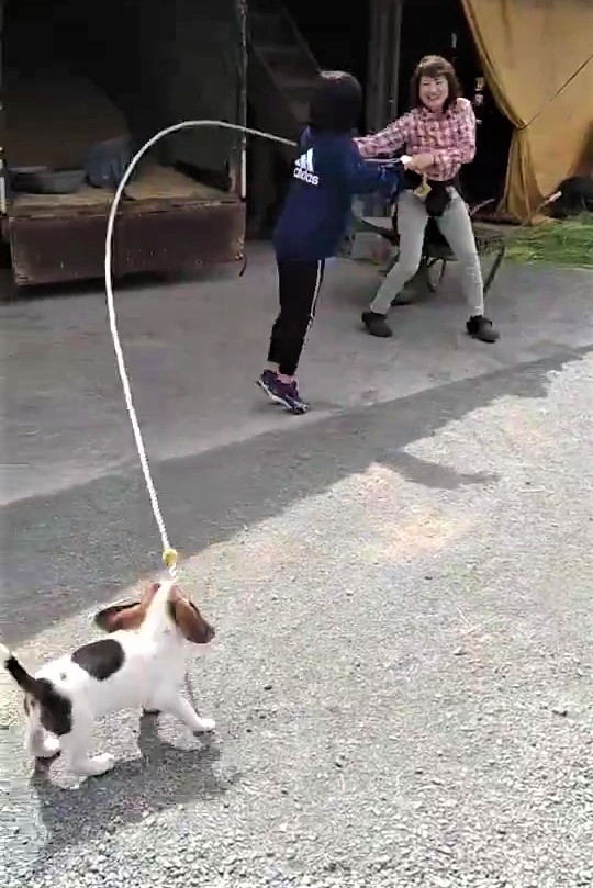 ▼原來那是一隻小米格魯,牠叼著牽繩的一端,配合女子一起甩繩子,讓小女孩能開心跳繩。不管女子怎麼甩,狗狗都能用嘴巴牢牢拉住繩子。牠的體型非常小,但已經很懂事、有擔當,能幫家人做一些事了。