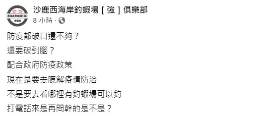 隨後更是接著霸氣Po文罵道:「防疫都破口還不夠?還要破到腦?配合政府防疫政策,現在是要去瞭解疫情防治,不是要去看哪裡有釣蝦場可以釣,打電話來是再問幹的是不是?」