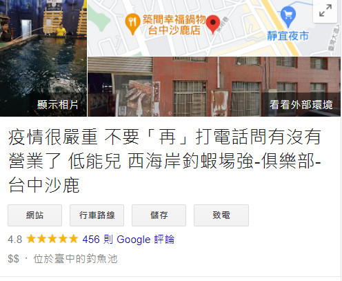 像是中部有一間釣蝦場明明在上週六就已經宣布暫停營業,但近日還是一直接到客人詢問是否有營業的電話,因此老闆不僅氣到直接改掉Google的店名譙:「疫情很嚴重,不要『再』打電話問有沒有營業了,低能兒」,隨後附上超嗆的貼文,讓網友都忍不住笑讚:「果然海線人!」