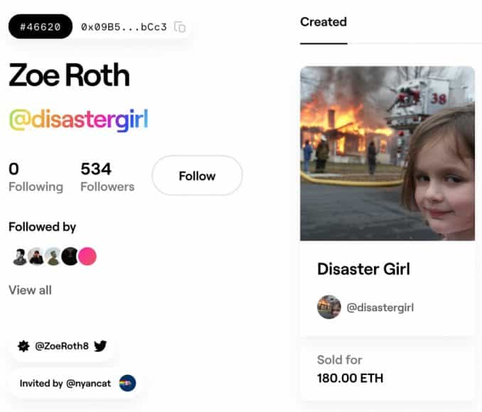 最近開始流行將藝術作品以 NFT 非同質化代幣方式出售,現年 21 歲的 Zoe Roth 和當年拍攝「災難女孩」照的父親 David Roth 早前決定,將災難女孩的照片原檔以 NFT 認識出售,結果成交價為 180 以太幣(約 409 萬港元)。Zoe 表示能夠將「災難女孩」原檔售出,代表他們對圖片保有控制權和代理權,又對相片成為了網民廣傳的迷因圖而感覺瘋狂。