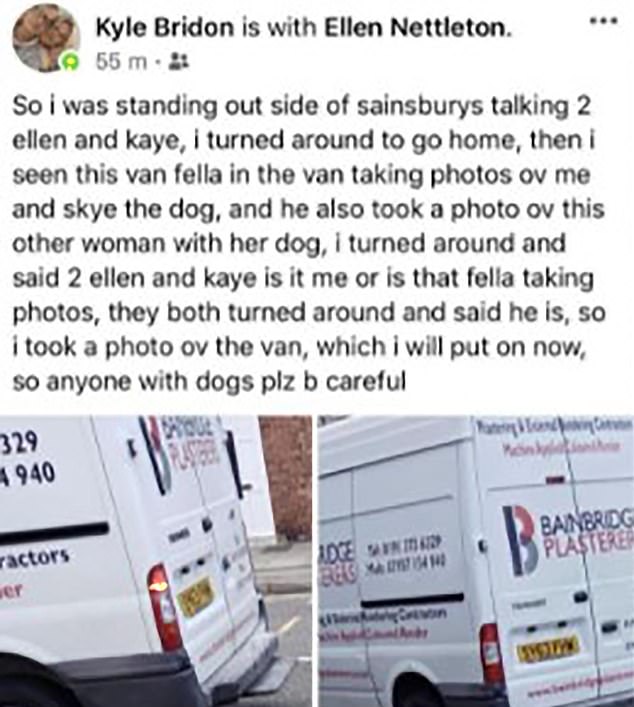 事情是這樣的,一名住在達拉謨(County Durham)的飼主凱爾(Kyle Bridon)日前帶著愛犬出門散步,途中在一家超市外遇到2名朋友就聊了一下,突然他一個轉頭,發現一名駕駛廂型車的中年男子(就是布萊恩大叔),停在路邊狂拍他家毛孩,便不禁懷疑對方是「偷狗賊」、疑似想要找機會偷走愛犬,隨即暗中反拍其車牌號碼還上傳網路提醒大家。