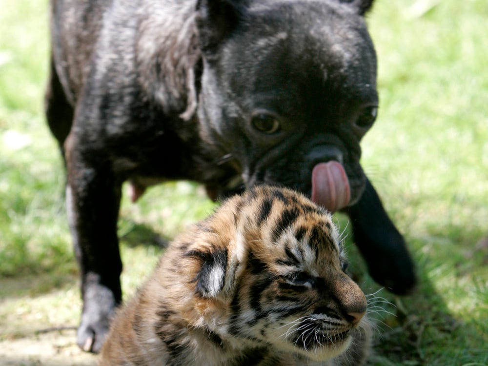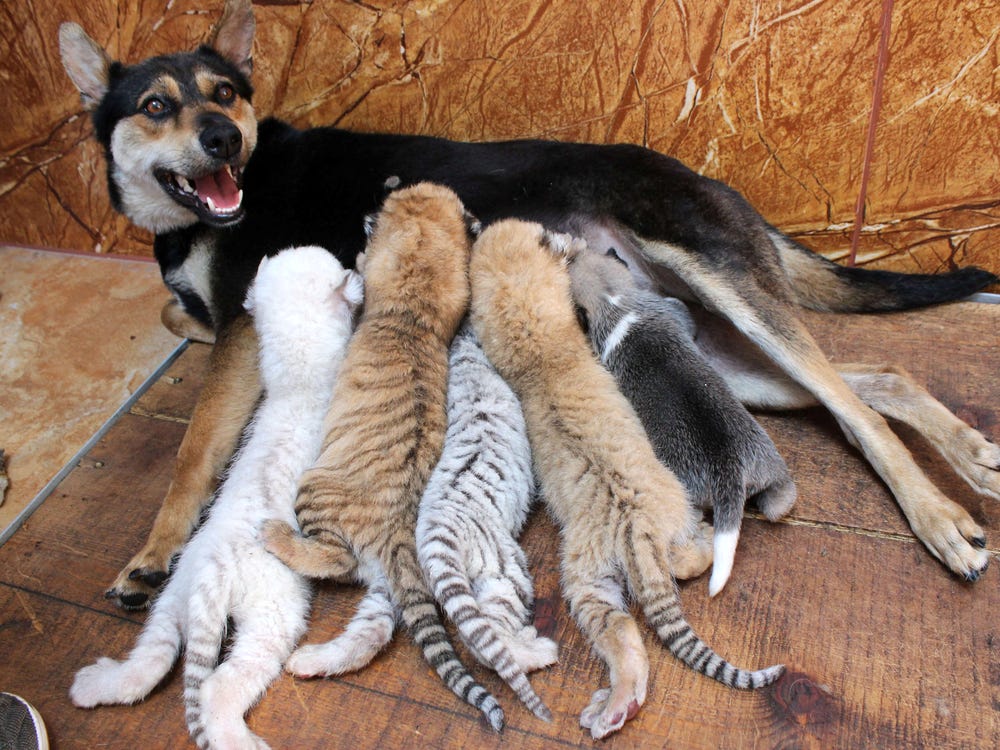 ▼老虎寶寶只有2週大,狗狗是牠的好保姆。