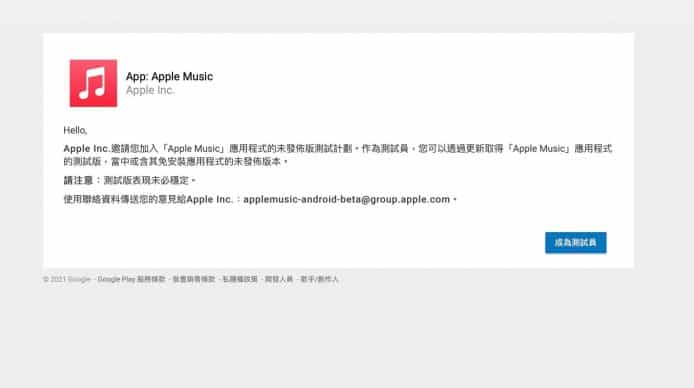 自從 Apple 發佈了 Apple Music 無損音樂的串流播放服務,並且支援杜比全景聲(Dolby Atmos)及空間聆聽音訊(Spatial Audio)功能後,一直只有 Apple 的 iOS 用戶才能享用。不過 Apple 最近向 Android 版的 Apple Music 用戶釋出 Beta 版,讓想事先體驗這項新功能的 Android 平台用戶加入 Apple Music 的測試計劃,用戶要到Google Play 相關頁面 申請成為測試員 (如下圖):