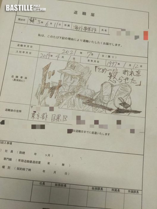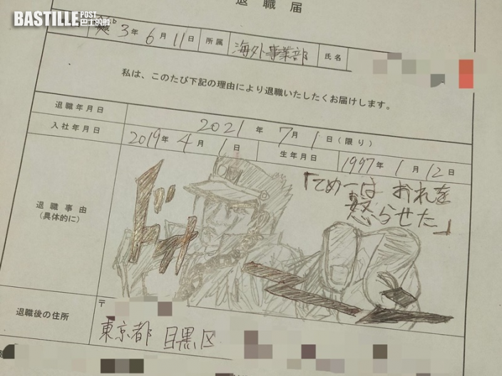 常言好頭好尾,山水有相逢,一般人離職時都會保留三分,日後好相見。但該名東京的打工仔不單寫了一封措辭霸氣的辭職信,更手繪《JOJO的奇妙冒險》人物空條承太郎的漫畫。