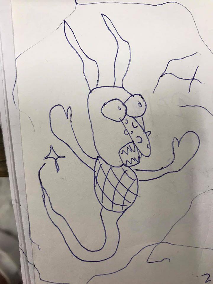她用藍色原子筆畫了一個像是卡通會出現的怪物(小編覺得有點像章魚哥),頭上還長了兩支角,臉部表情相當猙獰,下半身則是長長的尾巴,在貼文中寫下「關於結婚紀念日想要什麼禮物,畫了一張圖暗示老公,結果他完全看不懂我在表達什麼想哭⋯⋯人家就不好意思講這麼白,都不懂我的用心,希望有個浪漫的夜晚,因為有小孩以後很久都沒有兩人世界,但是我不好意思主動講,因為覺得有點丟臉,才想說用畫的,結果他看完拿去回收了。」。