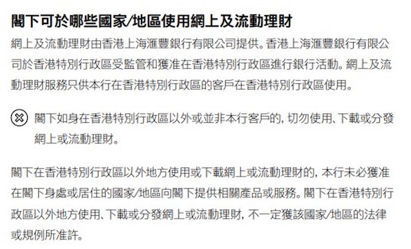匯豐銀行最近發佈的公告指,自 7 月 26 日開始網上及流動理財條款將推出修訂版本,其中一部分提及,由於匯豐銀行在香港受相關法例監管,因此其網上及流動理財服務只可以向在香港的客戶提供,而用戶如果在海外使用這些服務,則有機會觸犯當地法律。聲明中更強調「閣下如身在香港特別行政區以外或並非本行客戶的,切勿使用、下載或分發網上或流動理財」。
