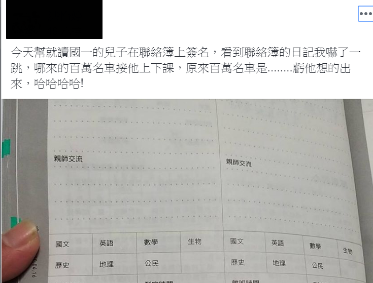 據《ETtoday》報導,有名媽媽在臉書社團「爆廢公社公開版」發文說,某天幫國一的兒子簽聯絡簿的時候,瞄到他寫的每日札記,原本還不以為意,不過仔細一看卻發現,裡面既然敘述自己「我每一天都搭乘百萬名車上課,每天也都搭百萬名車下課,時間一到就會來。」