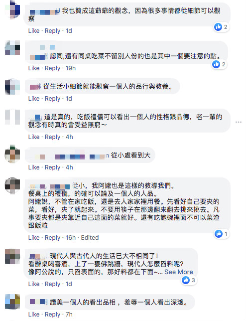 後來,女網友的男友還確實驗證了爺爺所說的話,某次他為了一個小小的投資案,不但找人借了一大筆錢,甚至連2人的感情也不顧,就這樣直接人間蒸發了,因此讓女網友更加堅信,吃相真的能看出一個人是否品行端正。而對此,許多人看完後也紛紛表示被說服了,「確實如此,從小我爸爸的教育就是餐桌禮儀,覺得很受用」、「超級認同,家教都是顯現在細節處」、「老一輩的觀念有時真的會受益無窮」。