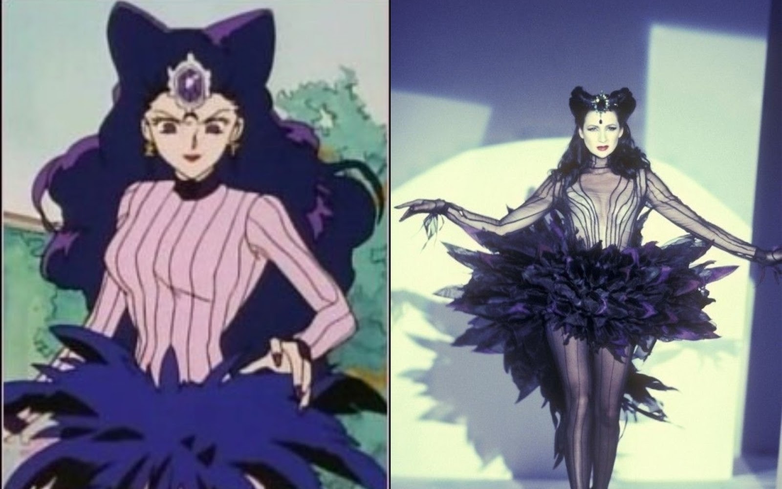 上面幾個知名大牌看完了你以為就結束了嗎?其實在反派中作者武內直子也有自己所愛的牌子,例如貝利爾女王、魔界姐妹中的可安,她們身上的衣著都來自法國時裝設計師兼品牌-Thierry Mugler,春夏和秋冬款,看看那多以黑紫色為點綴的色系,光在模特兒身上就反派味十足了,進到動畫裡當然更加生動囉!