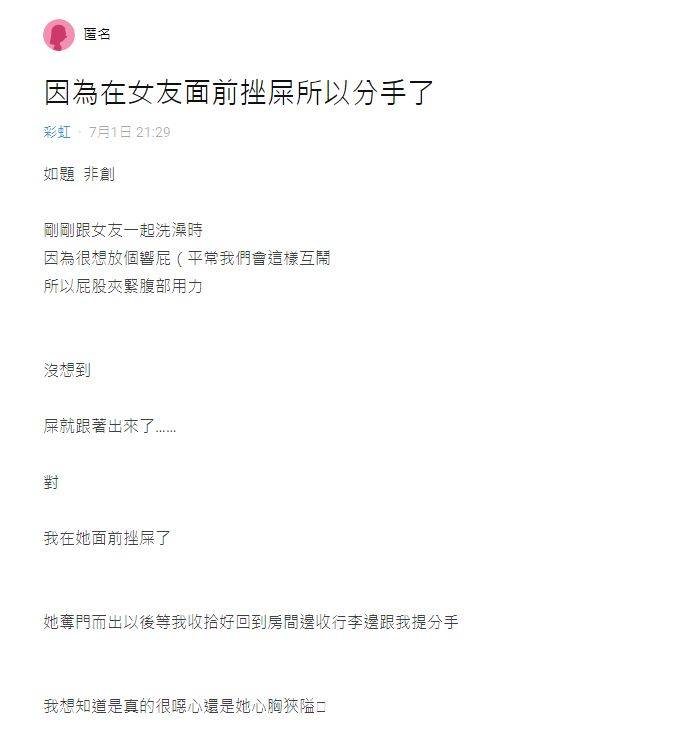 未料就在她放屁同時,竟同時排出大便,場面頓時變得非常尷尬,女友更生氣得馬上奪門而出。事主清潔好浴室後,就看到女友正收拾行李,還提出分手:「好難過,而且還要清屎更難過。」她又在文中詢問網民:「我想知道是真的很噁心,還是她心胸狹隘?」