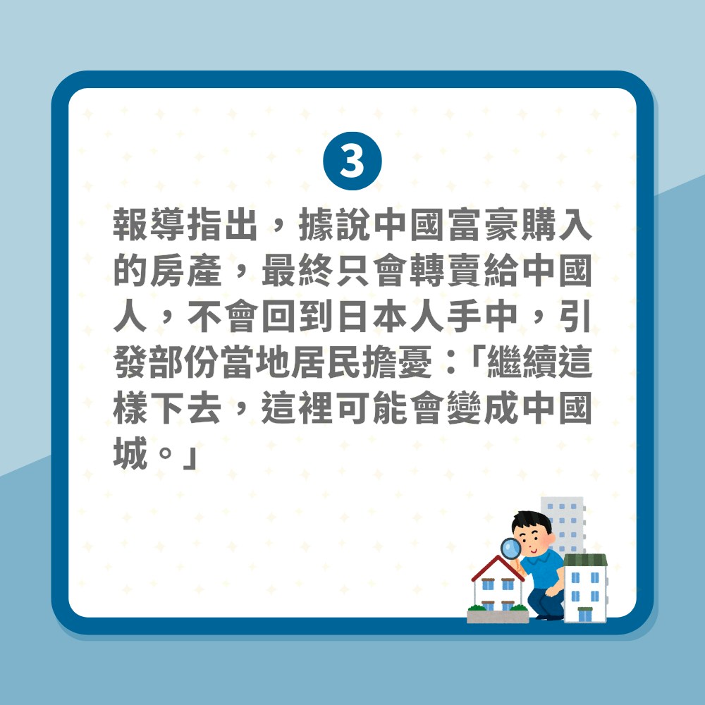 報導指出,據說中國富豪購入的房產,最終只會轉賣給中國人,不會回到日本人手中,引發部份當地居民擔憂: