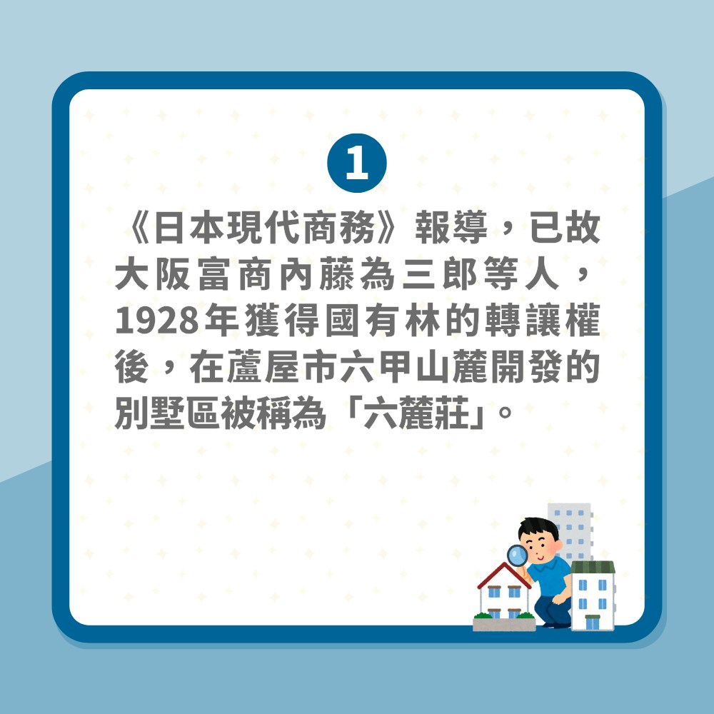 《日本現代商務》報導,已故大阪富商內藤為三郎等人,1928年獲得國有林的轉讓權後,在蘆屋市六甲山麓開發的別墅區被稱為「六麓莊」。該處的山路被拓寬至6公尺以上,每戶土地超過300坪。為了保持美觀,該區域是日本第一處進行「電纜地下化」的地區。