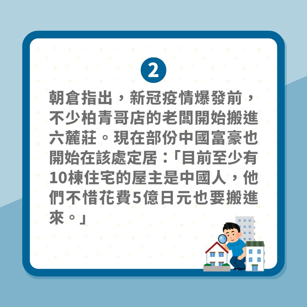 朝倉指出,新冠疫情爆發前,不少柏青哥店的老闆開始搬進六麓莊。現在部份中國富豪也開始在該處定居: