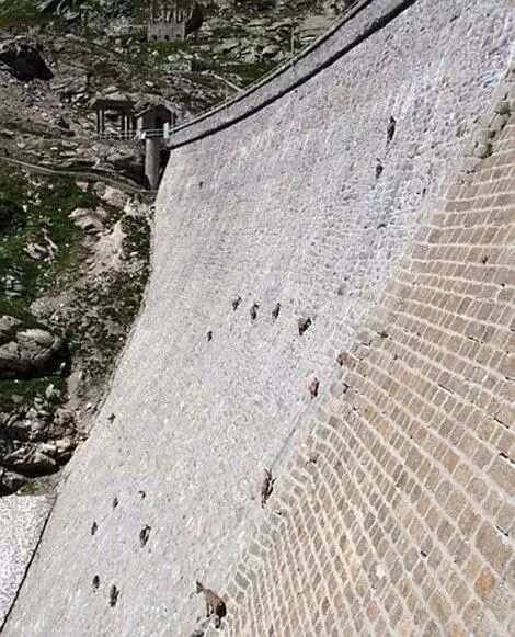 一名中國遊客去義大利 Cingino 大壩旅遊時,遠遠地看到大壩上有一些小黑點在動,等他把相機鏡頭拉進後,看到的景象徹底被驚呆了。原來是一群山羊在幾乎垂直的大壩上行走,景象看了令人膽戰心驚。