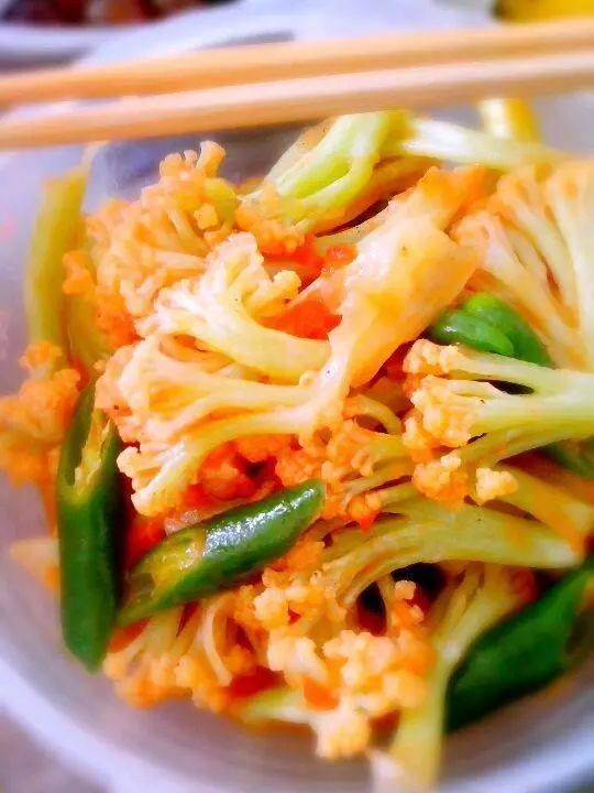 鍋中水開後將菜花焯熟,大約10分鐘,可以夾一小朵嚐一下,盛出控水,備用。