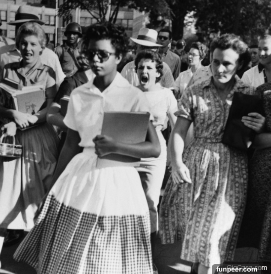 #4伊莉莎白(Elizabeth Ann Eckford)是1957年第一批(共9名)獲准進入小石城中央高中唸書的黑人學生。畫面中15歲的伊麗莎白走過校園,旁邊擠滿仇視的吼叫、注視和喧囂。該畫面讓該高中獲得國際關注。