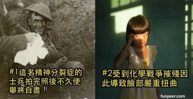 (source:嘻報,下同) 根據嘻報的報導,每個人都可以輕鬆用手機照相,網絡上處處可見曬貓、狗、曬小孩的照片,就連自拍和食物照都令人眼花撩亂。 但在智慧型手機沒那麼發達的年代,有些照片之所以能成為經典,是因為它們背負了沈重的故事,攝影師捕捉的瞬間,比文字勝過千言萬語。 #1 1916年9月索姆河戰役(一次世界大戰中規模最大的會戰),一名精神官能症病發的士兵。長期面對砲轟、恐懼和死亡,造成受創軍人恐慌,甚至無法睡覺、走路、說話或思考。最後發瘋失控。