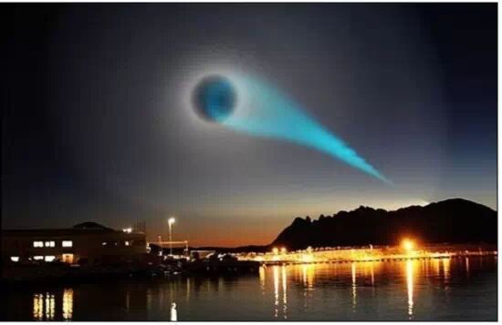 挪威北部地區上空曾經突然出現過一個怪異的藍色光圈。神秘光圈呈旋渦狀,從旋渦中心射出青綠色的光束。這一奇怪的現象引發了人們的種種猜測,如UFO、極光以及測試飛彈等。後經證實,它是由俄羅斯位於白海的核潛艇發射飛彈所致。本圖由攝影師簡·彼德·喬根森所拍攝,當時他正在前往工廠的路上。