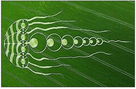 在英國牛津郡金斯頓庫姆比斯地區的一片大麥田中,出現了一個水母狀的麥田怪圈。這個怪圈大約有600英尺(約合182.9米)長。一位麥田怪圈研究專家稱,這個水母狀的麥田怪圈是一個圓周率的「密碼圖」,象徵著圓周率的前10個數字。