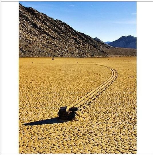 在美國加利福尼亞州死亡谷中,存在一種奇怪的滾石現象。這些石頭有的重達250磅(約合113.4公斤)。它們會以一種奇怪的方式在極端平坦的谷地上自行滾動,一年內的滾動距離有300多米。攝影師麥克·伯恩多年來一直在用鏡頭記錄著這些石頭的怪異行為。科學家認為,滾石現象由一系列特定的天氣狀況共同影響所致。
