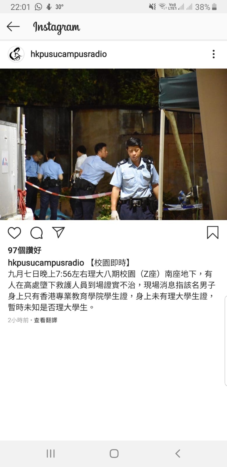 現場消息稱,死者年約30歲,身上有香港專業教育學院學生證及身份證,在Z座11樓墮下,疑先撞及大樹後墮地,現場未找到遺書。