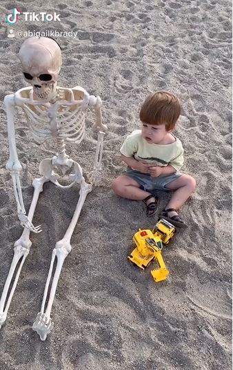 布雷迪表示,希奧超級喜歡這副骨骼模型,還幫它取名叫貝尼(Benny),不論去哪裡都堅持要帶著它,去海邊玩水時,希奧就乖乖地和貝尼坐在沙灘上,一邊在沙子上玩著玩具挖土機。