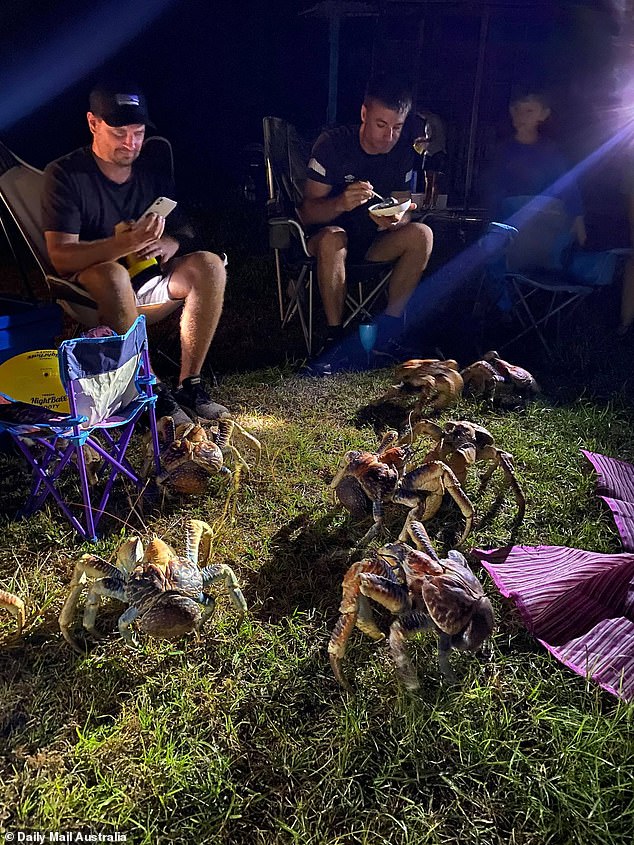 ▼9月19日晚,Luetich一家在耶誕島舉辦燒烤趴,並邀請島上的其他遊客一起玩。正當大家準備享用美食時,竟然有一大群巨大螃蟹把牠們圍了起來。那是一群椰子蟹,牠們都被嚇到,不知道該怎麼辦。