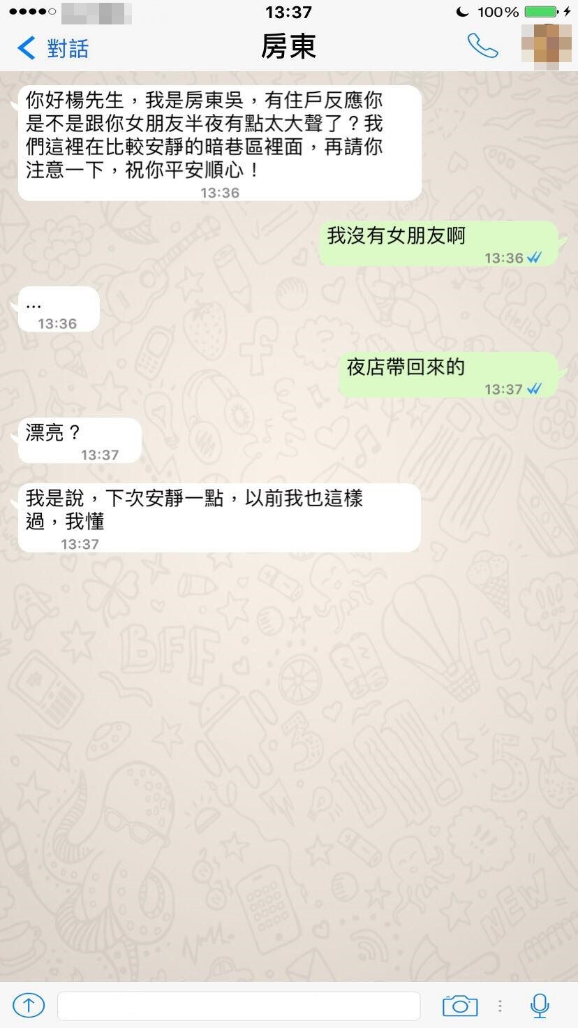 沒想到他才剛收到訊息就馬上回「我沒有女朋友啊」,讓房東也看傻,不知道該怎麼接下去的時候....他才回了一句「夜店帶回來的」,差點讓人以為鬧鬼了,沒想到這時候房東更爆笑,他竟然冷不防地回了一句「漂亮?」